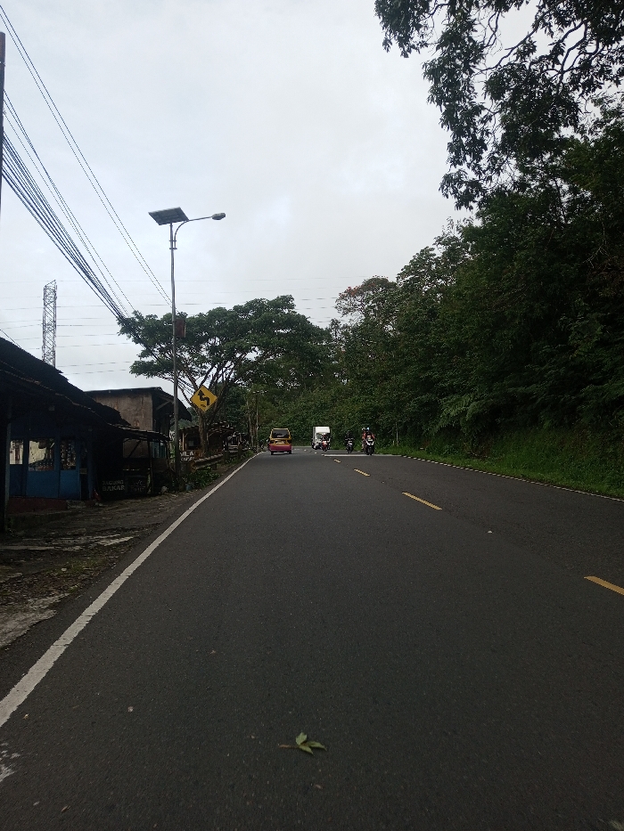 The scene captures an asphalt road in Sandamal Eliya, Sri Lanka, under an overcast sky. The road features a solid white line defining a narrow left shoulder and a broken yellow center line. A single green leaf is present on the asphalt in the foreground. To the left, a series of low-rise structures include a building with a blue facade and another featuring a 'JAGUNG BAKAR' sign. Overhead utility wires extend from poles along this side, leading towards a metal lattice tower. A solar-powered streetlamp stands near a yellow diamond-shaped road sign indicating a winding road, positioned amidst trees. The right side of the road is densely bordered by lush green foliage and trees. Approaching traffic, moving away from the viewer, consists of a light-colored minivan, followed by a white three-wheeled vehicle, and two motorcycles, one of which appears to have two riders. No pedestrians are visible.