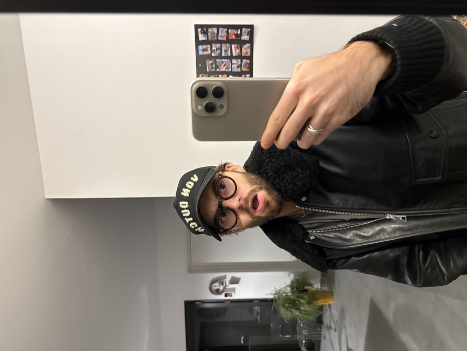 A male subject is depicted taking a mirror selfie indoors in Chambœuf, France. The individual wears a black baseball cap with "VON DUTCH" (reversed) in yellow lettering, round tortoiseshell-patterned eyeglasses, and a dark beard. He is dressed in a black leather jacket with a black shearling collar over a grey garment. His mouth is open, conveying an expression of surprise or exclamation. He holds a light-colored smartphone with a prominent multi-lens camera array in his left hand, displaying a silver ring on his left ring finger. The background, reflected in the mirror, reveals a white wall and a corner, with a dark-framed doorway partially visible on the left. To the right of the subject's head, a dark rectangular collage of multiple small images is affixed to the wall. Further left, a green leafy plant in a yellow pot sits on the floor, adjacent to translucent furniture elements.