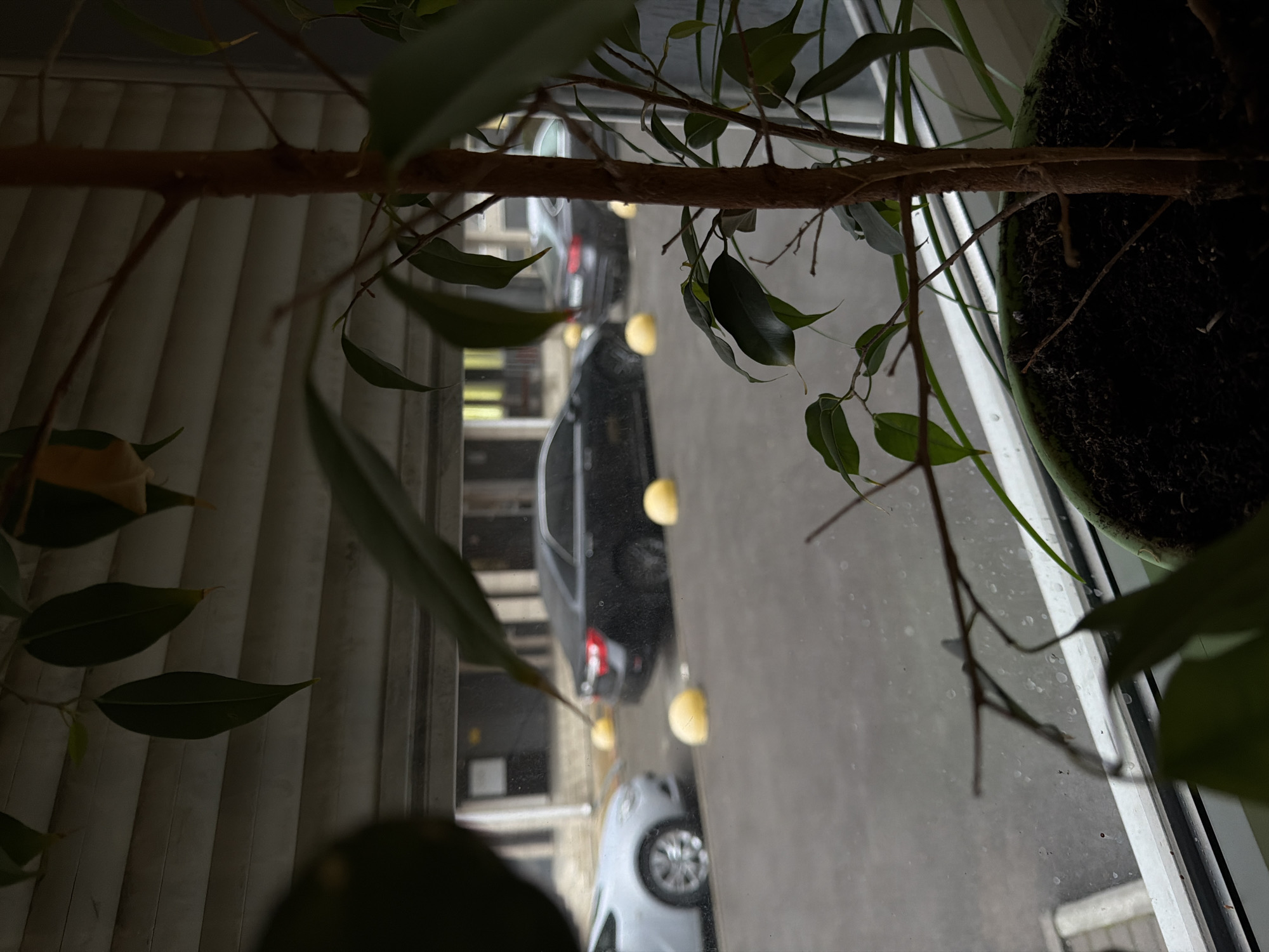 The image depicts an exterior urban scene in Aksay, Russia, viewed through a window from an interior perspective. In the immediate foreground, a potted plant with dark green leaves and a prominent brown trunk, situated in a green pot, partially obscures the lower right and central view. The windowpane exhibits multiple water droplets or smudges. Above the exterior view, partially raised horizontal window blinds are visible. Beyond the window, an asphalt-paved area, consistent with a parking lot or residential courtyard, occupies the midground. Three sedans are parked: a silver sedan is partially visible on the left, a black sedan (possibly a Toyota Camry) is parked centrally facing away from the viewer, and another dark-colored sedan is partially visible on the right. The black sedan has an indecipherable decal or text on its rear passenger door. Approximately five bright yellow, hemispherical bollards are distributed across the paved surface, positioned near and between the parked vehicles. The background consists of out-of-focus multi-story buildings, suggesting a standard urban environment. The lighting is diffused and overcast, indicating a cloudy day. No individuals or specific actions are discernible in the scene.