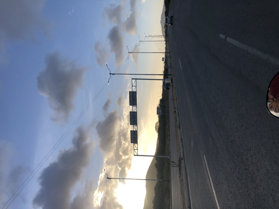 The image displays a wide asphalt highway or major road in La Tagua, Venezuela, captured during either sunrise or sunset. The sun, low on the horizon, is partially obscured by mountains and scattered cumulus clouds on the left, casting a warm, golden light across the landscape. The sky above is blue with varying cloud formations. The road features at least two lanes in one direction, demarcated by white dashed lines, and is flanked by a dirt shoulder and sparse, dry vegetation. A large metal gantry structure, supporting three blank rectangular road signs, spans the road in the midground. Numerous modern streetlights with dual heads line both sides of the highway, receding into the distance. Two vehicles are present: a dark-colored sedan is parked or stopped on the right shoulder, partially obscured by a streetlight pole, and a silver-colored sedan is visible traveling away from the camera in the far distance on the right lane. The perspective is from a vehicle, indicated by a partial reflection of a person's foot in a red garment visible in a mirror at the bottom center of the frame. No individuals are clearly visible within the scene.