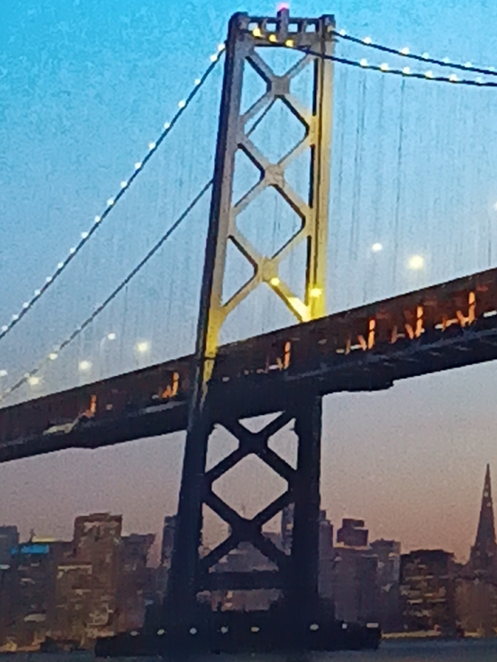 The image depicts a segment of the Bay Bridge, with its distinctive tower structure