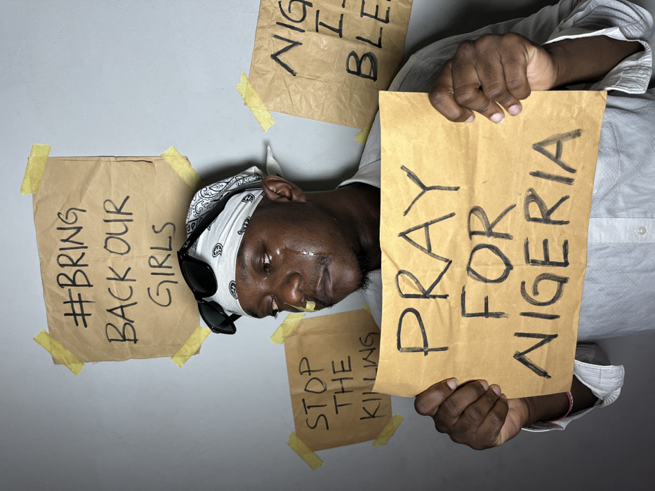 A crying man holds a sign reading "PRAY FOR NIGERIA". He wears a white shirt and a patterned bandana. Sunglasses are perched on his head. Several handmade signs are taped to a wall behind him. These signs include: "#BRING BACK OUR GIRLS," "STOP THE KILLINGS," and "NIGERIA BLESS." The scene suggests a protest or expression of grief and concern for Nigeria.