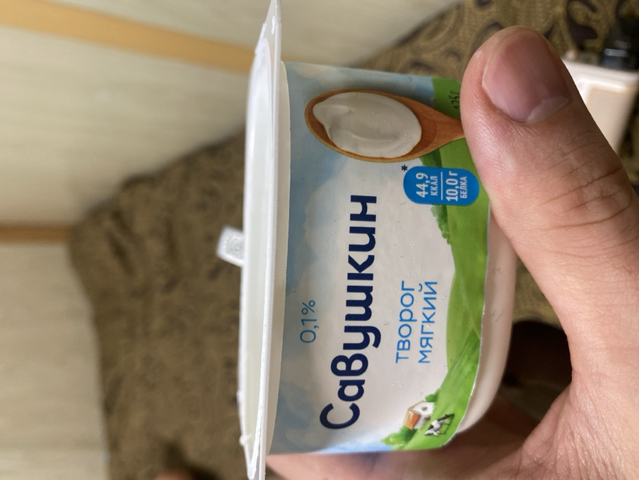 The image depicts a human hand holding a white plastic container of Savushkin brand 0