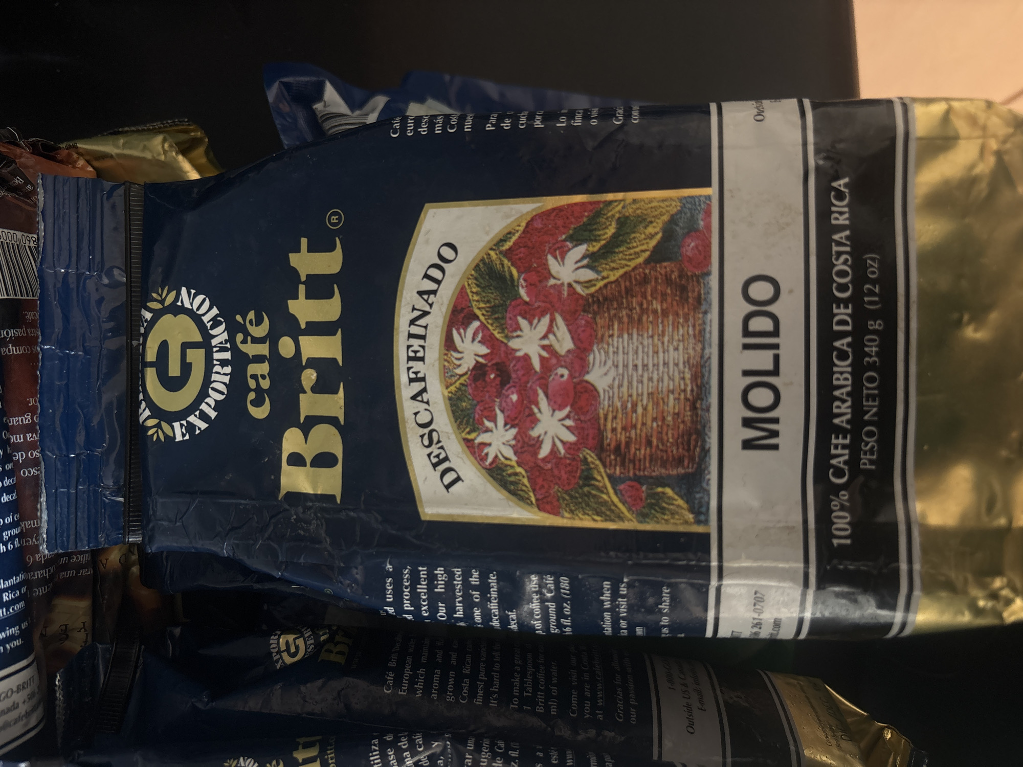A slightly angled, close-up shot focuses on a navy blue bag of "Britt" brand coffee