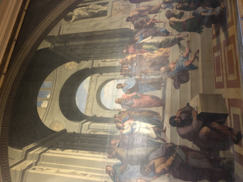The image displays a photograph of Raphael's fresco, "The School of Athens