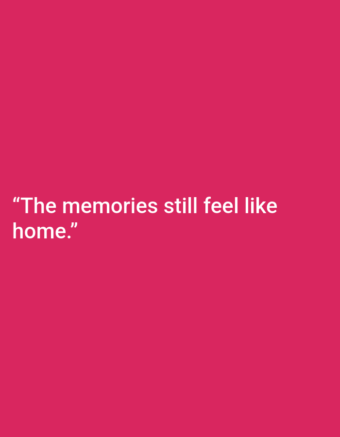 A pink square with the quote "The memories still feel like home