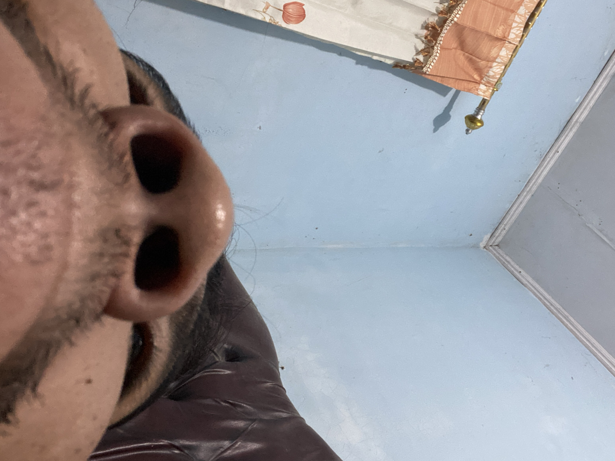 The image presents an extreme close-up, worm's-eye perspective of a human face, with the bridge and nostrils of the nose dominating the foreground. The individual has a medium-dark skin tone, with visible dark stubble or facial hair on the upper lip and chin area. Dark eyebrows are partially visible above the eyes, and the corner of the subject's left eye is discernible. Dark hair is visible around the top and sides of the head. To the right and slightly behind the subject's head, a dark brown, possibly leather or faux-leather, tufted piece of furniture is visible, consistent with the armrest or backrest of a sofa or chair. The background features a light blue painted wall, showing minor surface blemishes. A white ceiling with decorative molding lines the top edge of the wall. On the left side of the frame, a window is partially visible, covered by a peach-colored curtain with a white pattern and tassels along its bottom edge. The curtain is suspended from a metallic, possibly gold-toned, curtain rod equipped with decorative finials. A shadow from one finial is cast upon the wall. The lighting suggests an indoor setting, likely from an artificial source. This scene is situated in Lhoksewawe, Indonesia.