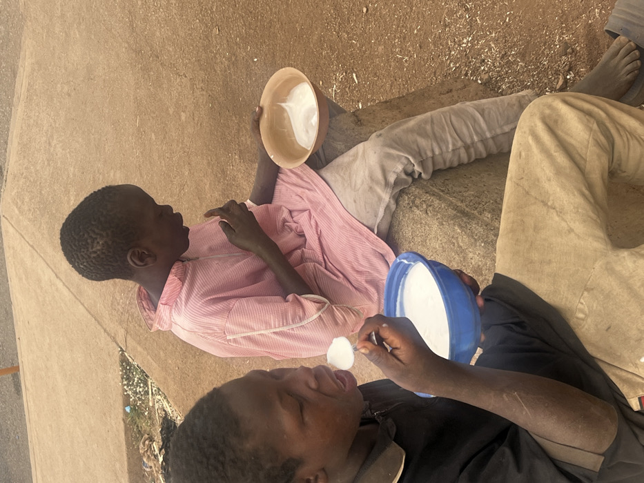 Two young people are pictured outdoors. One person is lying down, wearing a pink striped shirt and light-colored pants. They hold a light brown bowl filled with a white substance. Another person sits nearby, dressed in a dark shirt and khaki pants. They are feeding the first person with a spoon from a blue bowl also filled with the white substance. Both bowls are filled with what appears to be a meal of some sort. They seem to be in a public area, near a sidewalk.