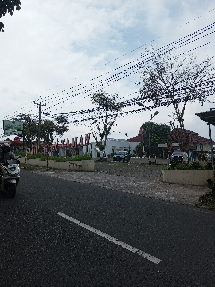 This image depicts a roadside scene on an overcast day in Sandamal Eliya, Sri Lanka. In the left foreground, a white scooter, bearing license plate B 6923 TKC, moves on a dark asphalt road with a single solid white line marking. The scooter is ridden by one individual wearing a helmet. To the right, a paved entrance leads into a commercial or hospitality complex. The boundary of this complex is defined by a low concrete wall adorned with green shrubbery, featuring large red block letters that spell "TAMAN." A prominent green sign identifies "RINDU ALAM HOTEL" and "Pondok AL-IKHLAS." Within the complex, a white building is visible, and further back, a structure with a multi-tiered reddish-brown roof stands. Two dark-colored cars are parked inside the complex. The sky is largely overcast, and numerous utility wires are strung across the upper portion of the frame, supported by several utility poles, one of which holds a streetlight. Trees, some with sparse foliage, are scattered along the roadside and within the complex.