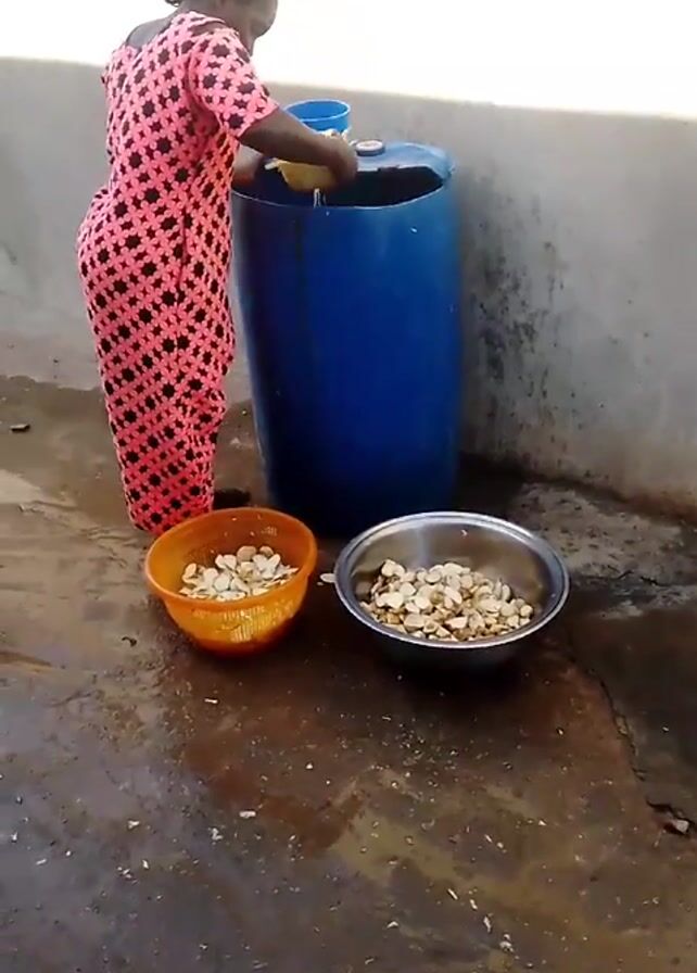 A woman in a pink floral patterned dress is adding something to a large blue barrel. Two bowls of what appear to be seeds are on the ground in front of the barrel. The ground is concrete, and there is a concrete wall to the left of the woman and barrel. The woman has dark hair pulled up. She scoops up seeds from a yellow bowl and adds them to the barrel. She then appears to be cleaning the yellow bowl.