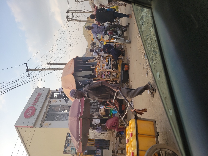 A street scene depicts a vendor pulling a cart filled with yellow containers past an "Itel Home" store. Utility poles with numerous wires crisscross the sky. Other vendors with parasols sell goods on the roadside. Several people are seen, some on a motorbike, others standing near stalls. The perspective suggests the photo was taken from a vehicle.