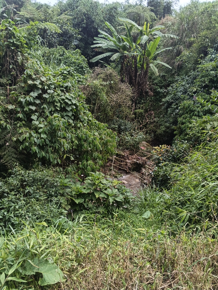A dense, lush landscape dominated by greenery. Banana trees with broad leaves stand amidst a variety of trees, shrubs, and foliage, creating a tropical ambiance. A small rocky stream or cascade is partially visible, obscured by the abundant vegetation. The foreground is filled with tall grasses and weeds, adding to the untamed, natural character of the scene.