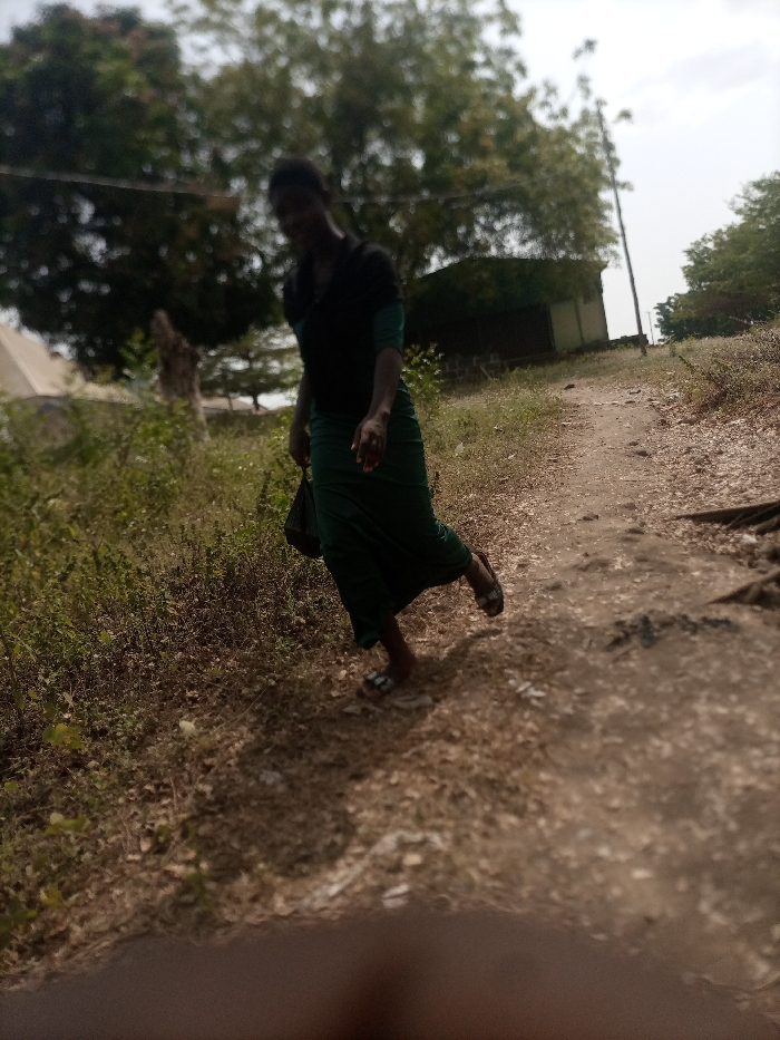 An individual is depicted walking on an unpaved dirt path in Adankolo, Nigeria. The person, appearing female, is seen in mid-stride, with their right foot lifted. They are wearing a dark-colored long-sleeved top, a long dark green skirt, and sandals. A dark bag is carried in their left hand. The path is bordered by sparse green vegetation and dried grasses. In the background, large trees with green foliage are visible. A light-colored building with a dark roof and a utility pole are present to the right of the path in the middle distance. The sky is overcast or hazy. The image exhibits motion blur, particularly on the individual.