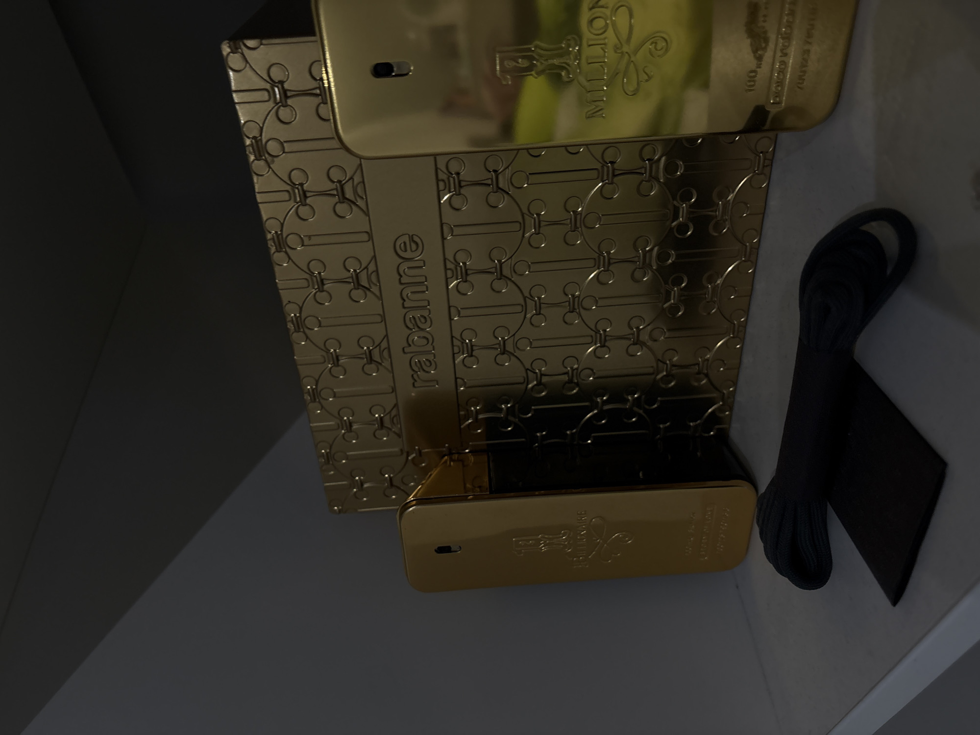 The image depicts an indoor scene with three primary gold-colored objects arranged on a light-colored, flat surface, likely a shelf. Central to the composition is a large, rectangular, gold-toned box featuring an embossed, repeating geometric pattern of linked shapes. The word "rabanne" is embossed horizontally across its center. Flanking this box are two gold-colored perfume bottles, both upright and designed in the shape of a rectangular ingot. The bottle on the left displays the embossed text "1 MILLIONAIRE" vertically on its front, with a dark spray nozzle visible on its top edge. The bottle on the right also displays "1 MILLION" embossed on its front, along with "100ml" and other smaller text towards its base, and also features a dark spray nozzle. In the lower foreground, resting on the light-colored surface, is a coiled, dark-colored fabric item, possibly a rope or strap, positioned next to a small, flat piece of dark fabric. The background consists of a dark, plain wall or partition, with a diagonal shadow line visible in the upper left, suggesting a corner or an angled light source. The overall lighting is dim. There are no people or discernible actions. The image does not contain any contextual information or identifying features that would allow for the determination of a specific location within the city of Kresna, Bulgaria; the scene is consistent with a generic indoor display.