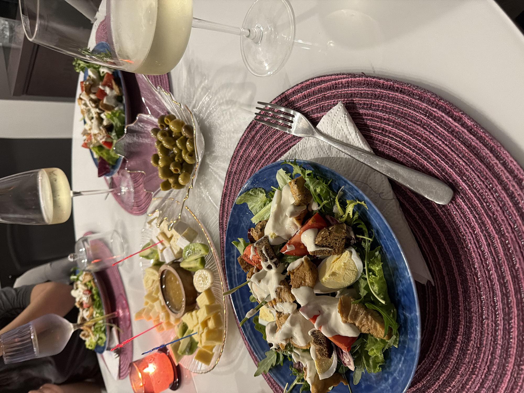 An indoor scene in Azov, Russia, depicts a dinner table set for at least two individuals. The white, possibly glossy, table surface is adorned with circular, woven deep pink placemats. In the foreground, a blue ceramic plate holds a salad comprised of green leafy vegetables (likely lettuce and arugula), halved hard-boiled eggs, cuboid pieces of what appears to be cooked poultry or fish, red tomato or bell pepper chunks, dark croutons, and is generously drizzled with a white, creamy dressing. A silver four-tined fork rests on a white textured paper napkin beside the plate. To the upper left, another blue plate with a similar salad is partially visible, indicating a shared meal setting. Above and slightly to the right of the central salad, a clear glass bowl, shaped like a leaf, contains a quantity of green olives. Further back on the table, a large clear glass platter presents an assortment of appetizers: cubed yellow cheese, soft white rind cheese pieces, slices of green fruit (possibly kiwi or avocado), and a small, dark wooden bowl filled with a viscous amber liquid (likely honey or a dipping sauce). Various colored decorative toothpicks are inserted into some of these items. Adjacent to this platter, a red votive candle burns within a clear glass holder, casting a warm glow. Several stemmed wine glasses are present. Two in the mid-ground contain a pale yellow liquid, consistent with white wine. A third glass to the upper left contains a clear liquid, likely water. Partial views of two individuals are visible in the background, out of focus; one person's arm and torso wearing a dark garment are discernible behind a wine glass. The overall environment suggests a private dining space, possibly a home.