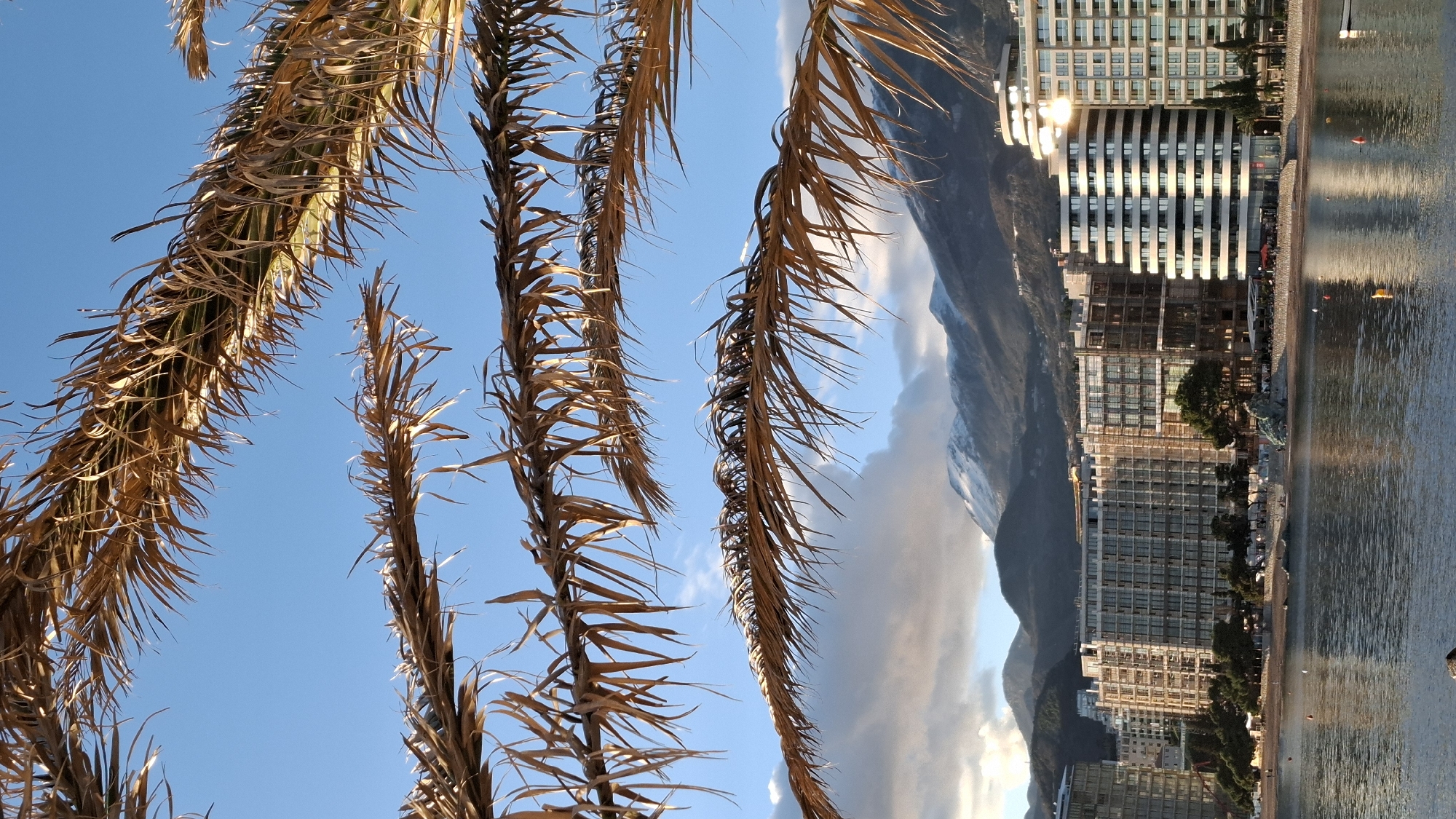 A sideways, daytime shot shows fronds from a palm tree in the foreground, and a city and mountain range with a light dusting of snow in the background
