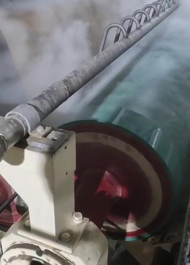 n industrial setting with a large, rotating drum partially visible, appearing to be part of a manufacturing machine. The drum is green with a red and white striped edge. White steam or vapor is heavily present, obscuring parts of the machine and the surrounding area. The machine also includes metal piping and support structures, painted in light colors. The floor is metal and appears wet. The general atmosphere is one of industrial process, possibly involving heat or steam treatment of materials.