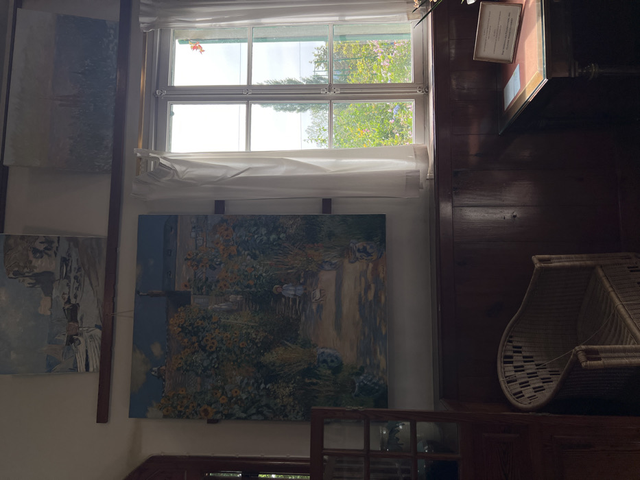 This image depicts an interior room, specifically the studio or dining room of Claude Monet's house in Giverny, France. The scene focuses on three distinct oil paintings displayed on a light-colored wall above dark wooden wainscoting. The most prominent painting, centrally located and approximately square, illustrates a sunlit garden path lined with vibrant sunflowers, leading up to a house. A person in a light-colored hat walks along the path in the foreground, with another figure further up. Above this, on a dark wooden shelf, two smaller paintings are visible: one on the left shows a rocky coastline with boats on a beach under a cloudy sky, and another on the right is a landscape with a muted sky and distant structures. To the right of the large painting, a multi-pane casement window, framed in white, offers a view of a lush garden outside. Sheer white curtains are tied back on either side of the window. The exterior scene reveals dense green foliage, various flowering plants (including red and purple blossoms), and a tall, slender tree. Bright daylight illuminates the outdoor scene, contrasting with the slightly dimmer interior. A red plant or flower is visible near an open pane of the window on the right. The lower half of the room features dark, polished wooden paneling. In the bottom left quadrant, a natural wicker armchair with armrests is positioned. To the right, beneath the window, a small, dark wooden table with an inset reddish-brown top stands, bearing a small, framed informational plaque. On the far left, a dark wooden cabinet or doorway with glass panes is partially visible, containing dimly lit ceramic vessels.