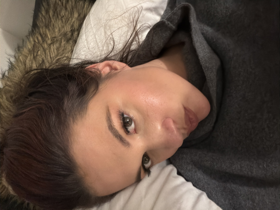 A woman lies on a white pillow, partially covered by a gray garment. Her head is tilted to the side, facing the camera. She has brown hair, fair skin, and green eyes. Her lips are slightly pursed. A fur-lined edge is visible near her head, possibly part of a jacket or blanket. The image appears to be taken indoors with soft, natural lighting.