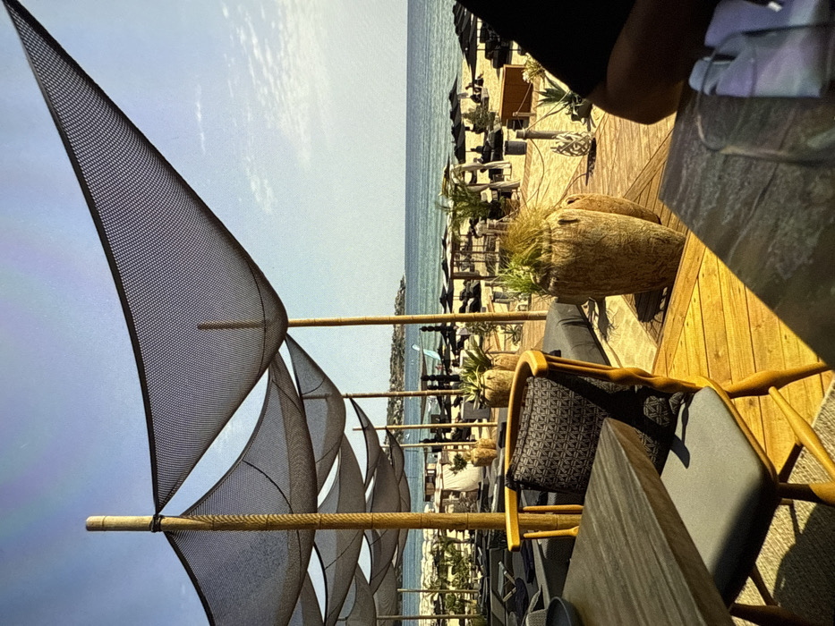 - "This image depicts an outdoor coastal dining or lounge area overlooking a sandy beach and the sea, under a clear blue sky" by FM-y0FBD2, licensed under CC BY 4.0
