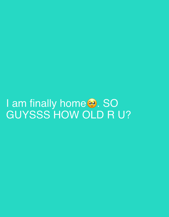 The image is a simple text graphic on a teal background. The text reads, "I am finally home🥺. SO GUYSSS HOW OLD R U?" There is an emoji of a pleading face next to the word "home."