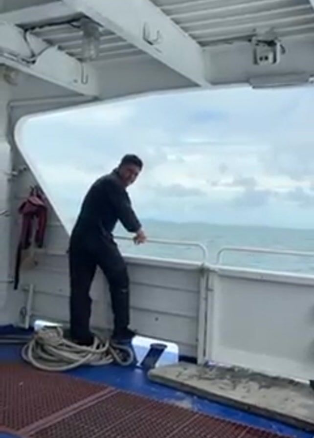 A man in a black jumpsuit is standing on the deck of a boat. He is leaning against the railing and looking out at the ocean. The boat appears to be moving, as evidenced by the choppy water and distant landmasses. There are some ropes and a life jacket visible on the deck. The weather looks overcast. The structure of the boat is painted white, with some blue painted areas on the deck.