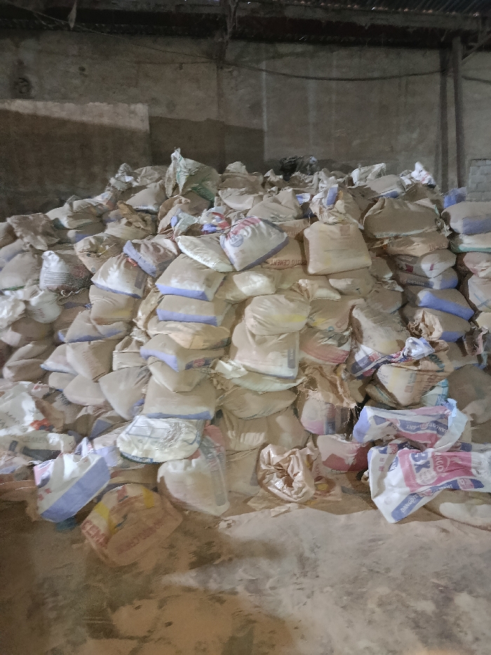 A substantial pile of stacked sacks fills a large indoor space, likely a warehouse or storage facility