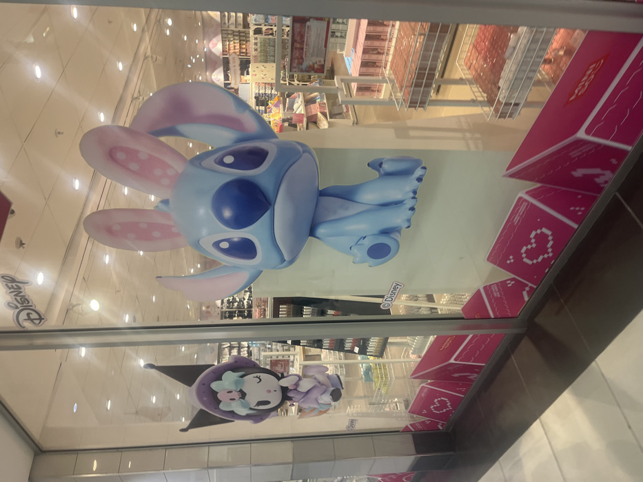 A display case featuring Disney characters is showcased. A large, blue Stitch figurine with pink inner ears dominates the upper portion. Below it, a smaller figure in a witch's hat is visible. The background reveals a brightly lit retail space with shelves stocked with merchandise. The display case has pink boxes with pixelated heart designs along the right edge, and the Disney logo is visible on the glass.