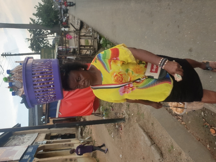 The image displays a street scene in Umuode, Nigeria, under an overcast sky. A woman, the central figure, walks along a paved roadside towards the viewer's right. She has dark, curly hair and is dressed in a yellow short-sleeved blouse featuring a multi-colored floral and striped pattern, a black knee-length skirt, and dark sandals. She carries a large purple plastic basket on her head, filled with numerous small, light-colored items, consistent with dried food products, and several plastic bottles with green caps. A white crossbody bag with a red "Supre" logo is worn over her right shoulder. Beaded bracelets are visible on her left wrist, and her right hand holds a small, light-colored rectangular object. In her left hand, she carries a smaller bucket containing similar items to those in the head basket. To the woman's immediate left, a young boy in a purple shirt walks on a dirt path adjacent to a building. The building's facade displays "BIBLE CHURCH" signage and posters. A black utility pole stands near the concrete curb. To the woman's right, a paved road extends into the distance. A ditch, partially covered by wooden planks forming a makeshift crossing, runs parallel to the road. Further down the road, a sign identifying "BLESSINGS VILLAGE HALL" and "UMEGBU VILLAGE HALL" is partially visible. Informal structures, including a red tarp-covered stall, are present along the right side of the road. A motorcycle with a rider is visible in the distant background on the road. The environment features a combination of paved and unpaved surfaces, with scattered vegetation and debris along the roadside.