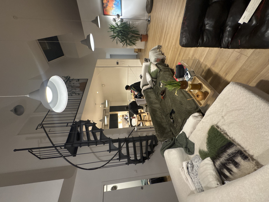 The image displays the interior of a multi-level residential living space located in Saint-Denis, France, illuminated by artificial lighting. In the immediate foreground, a white sectional sofa is furnished with various blankets and pillows, including white, green, and a black-and-white patterned textile. Adjacent to it, a transparent acrylic coffee table holds a woven tray containing a potted snake plant, a black portable speaker, and several small decorative objects. A black leather armchair is partially visible on the far right. The mid-ground features a second, larger sofa draped with a dark green textured blanket and multiple pillows. To its right, a tall potted Yucca plant stands next to a silver multi-headed floor lamp. An abstract painting featuring orange, blue, and white hues hangs on the wall, beneath which a round pet bed rests on the light-colored wooden floor. In the background, an open-plan kitchen and dining area is situated on a slightly lower level. Two individuals are seated at a light-colored wooden table. One person is viewed from the back, wearing a dark top, while the second individual is partially visible in profile, wearing a dark jacket with a green collar detail. A dark water bottle is present on the table. The kitchen area features dark cabinetry and light countertops, illuminated by three suspended pendant lights. A prominent black metal spiral staircase ascends from the left side of the image to an upper mezzanine level, where a black metal railing and a potted plant are visible. The high white ceiling of the main living area is fitted with multiple grey pendant lights, and a skylight is observable in the upper right quadrant. A white door on the far left is ajar, revealing a bed within an adjacent room.