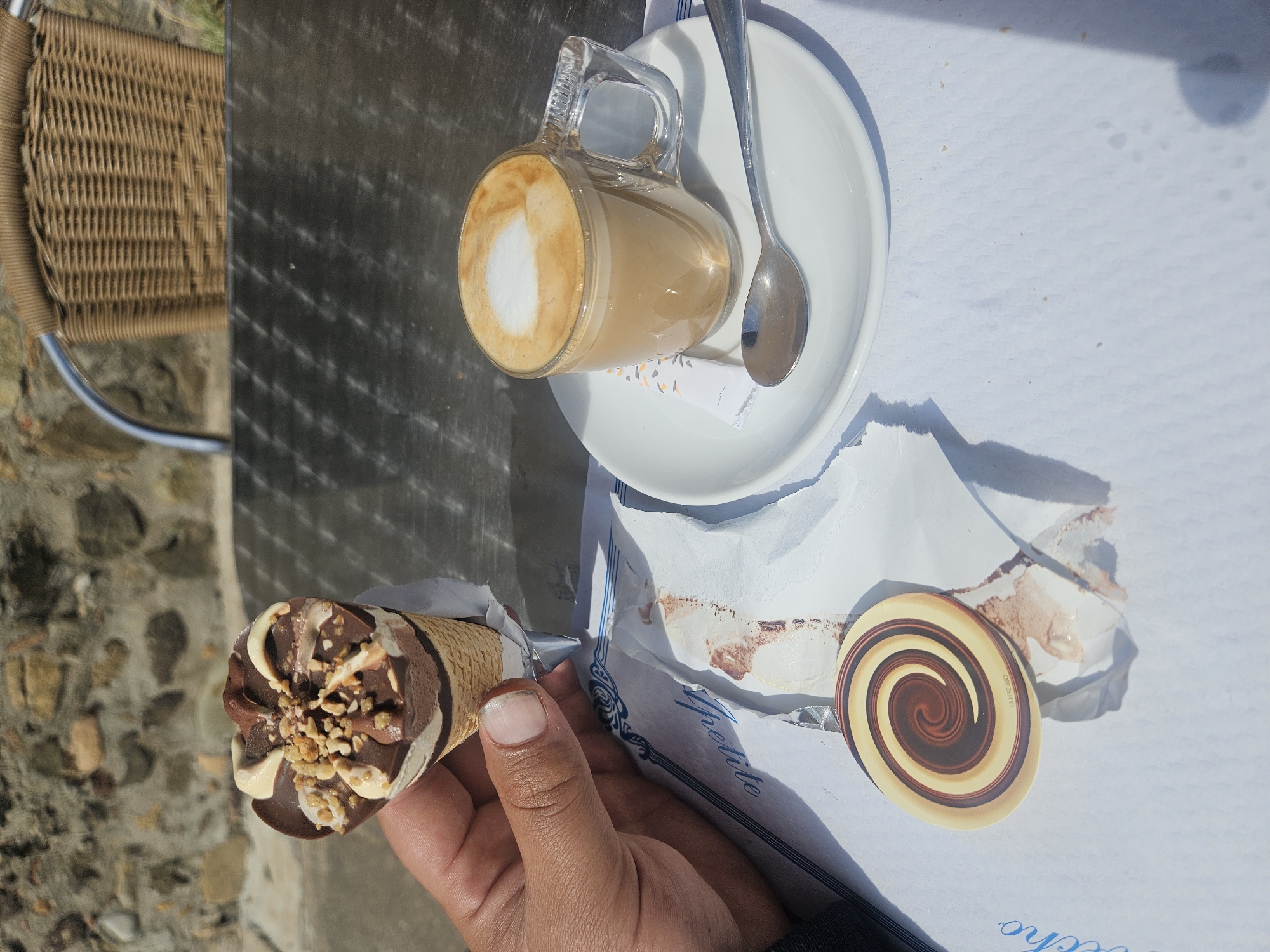 A top-down shot shows a coffee cup and a partly eaten ice cream cone on a table. The coffee cup is made of glass and contains a latte with a white foam top. It sits on a white saucer with a spoon. Next to the coffee cup, a chocolate and nut ice cream cone is held in a hand with a visible fingernail. The wrapper of the ice cream cone is nearby, along with a round, swirled chocolate candy or decoration on a white paper napkin with a blue text "Apetite" and "echo". The table has a dark surface, and a wicker chair is partially visible in the top left corner. In the lower left, there is a view of a stone surface. The scene is likely in Mas Aliu, Spain, as indicated by the mention of the city's name in the prompt.