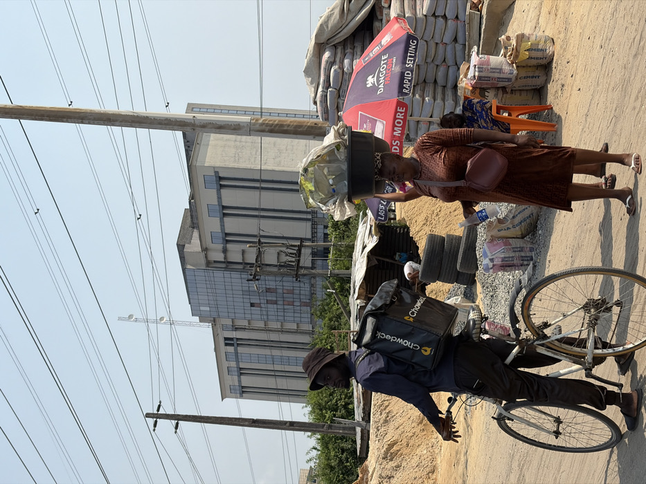 This image depicts an outdoor scene in Ikota, Nigeria, under a clear, bright sky. In the foreground, a dark-skinned man in a dark-colored long-sleeved shirt and trousers, wearing a brown bucket hat, stands straddling a white bicycle. A black "Chowdeck" delivery bag with yellow lettering is slung over his back. He is positioned facing right but his head is turned to the left, looking away from the camera. To his right, a dark-skinned woman in a brown, patterned, knee-length dress and white flip-flops carries a black plastic basin filled with light-colored plastic items and bags on her head. She also carries a maroon shoulder bag across her body and holds a white plastic bottle in her right hand. Her gaze is directed towards the right. The midground features a dirt and sand-laden ground, indicative of a construction or undeveloped area. Behind the woman, a red and white "DANGOTE RAPID SETTING" branded umbrella is open, providing shade over several stacks of white cement bags. Partially visible under the umbrella are at least two other individuals, one seated on an orange plastic chair. To the left of the umbrella, a small, makeshift wooden structure with a corrugated metal roof is visible, along with stacks of black tires and piles of gravel. In the background, a modern, multi-story building with a light-colored facade and dark glass windows rises prominently. A tall communications tower with three antenna dishes is visible behind the building. Multiple overhead power lines span across the sky, supported by wooden utility poles, one of which is prominently featured on the left side of the frame. The overall lighting suggests a sunny day.