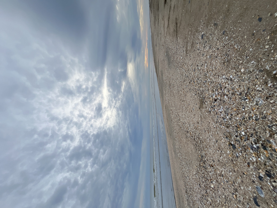 The image displays an expansive, uninhabited beach and ocean scene under an overcast sky, located in the city of Alueduamuka O, Indonesia. The upper two-thirds of the frame are dominated by a dense, grey cloud cover, consistent with stratocumulus formations, with brighter, diffused light emanating from obscured areas in the central and right portions, suggesting the sun's position. A subtle, light orange-yellow tint is visible along the distant horizon on the far right, indicating either dawn or dusk conditions. The horizon line is clearly defined, separating the sky from the body of water and the coastline. The ocean, occupying the left mid-ground, exhibits calm, grey-blue water with minor waves breaking gently onto the shore. A slender, dark, vertical object, possibly a distant marker or buoy, is faintly discernible on the water's surface in the mid-left distance. The foreground and mid-ground of the beach consist of a wide, light-brown sandy expanse heavily mixed with a multitude of small, multi-colored shells, pebbles, and shell fragments, creating a rugged and varied texture. This shell-laden strip transitions to a broader area of darker, finer sand on the far right, which appears largely free of debris. There are no individuals, animals, structures, or any discernible human activity present within the depicted scene.