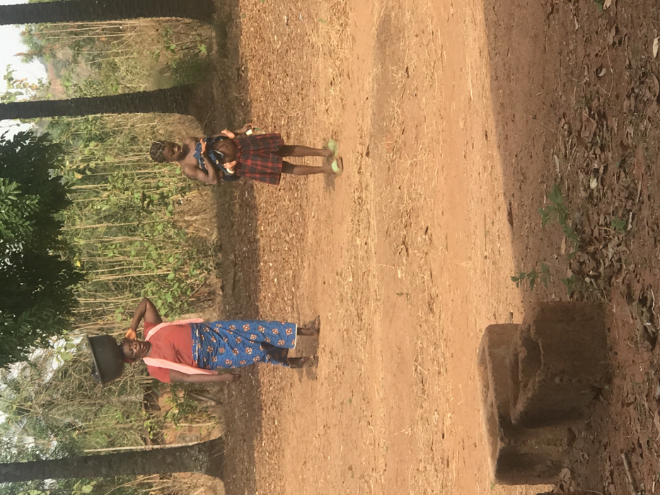 Two women stand on a dirt path in a rural setting. One woman balances a bucket on her head, wearing a red shirt and blue patterned wrap. The other woman carries a baby in her arms and wears a plaid skirt. Trees and vegetation surround them. A small brick structure sits beside the path. The ground is brown and dusty.