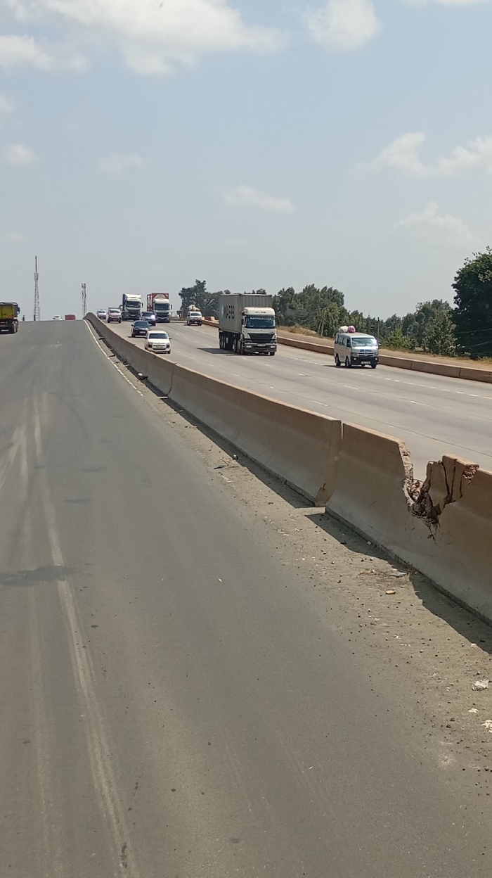 The image depicts a multi-lane highway in Sigona ward, Kenya, under a hazy sky with scattered white clouds. The perspective is from the left carriageway, looking forward and slightly right across a median. The immediate foreground displays an asphalt road surface with minimal debris and faint tire marks. To the right, a dirt and gravel shoulder borders a line of pre-cast concrete barriers. One barrier segment on the far right exhibits significant impact damage, exposing fractured concrete and rebar. Traffic is active on both visible carriageways. On the right, vehicles are observed moving towards the viewer, including a white semi-truck with a beige 'MOL T' cargo container in a middle lane, followed by a white passenger van carrying two light-colored, round objects on its roof. On the left carriageway, multiple vehicles are seen moving away from the viewer on an uphill incline, including several semi-trucks (one with a red cargo container) and various passenger cars, such as a white sedan and a dark sedan. The background features green trees and vegetation bordering the highway. A tall, thin communication tower is visible on the distant left horizon. No individuals are discernible within the scene.