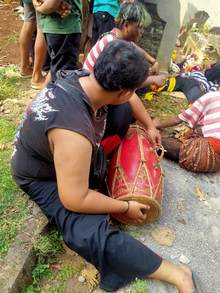 In Sumberejo, Indonesia, an outdoor scene unfolds during the daytime. The foreground features a person with dark hair, wearing a black sleeveless shirt with a white graphic and black pants, seated on the ground with legs extended. Their left hand supports a red and gold ornate kendang drum, which has bells attached to its lacing. A black bag is worn over their left shoulder. To the right of this individual, another person is seated, visible from the back, wearing a red and white striped shirt and a patterned sarong-like garment. Further to the right and slightly behind, a person with light-colored, possibly dyed hair and dark facial markings is also seated, wearing a red and white striped shirt. In the background, two individuals are lying on the ground: one wears a black and yellow striped garment and a white mask with black markings, while the other is partially visible in a red and white striped shirt next to a similar mask. Other individuals are standing or partially obscured in the periphery. The ground consists of dirt and gravel with scattered green vegetation and dry leaves, and a concrete curb is visible on the left.