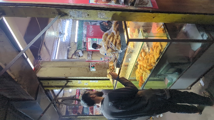 A street food stall at night has two male customers. One customer is standing in front, pointing to the various fried snacks in a glass display case. The other customer stands behind the vendor near a Coca-Cola fridge. Overhead, fluorescent lights illuminate the stall's simple metal frame, with various wires and electrical components visible.