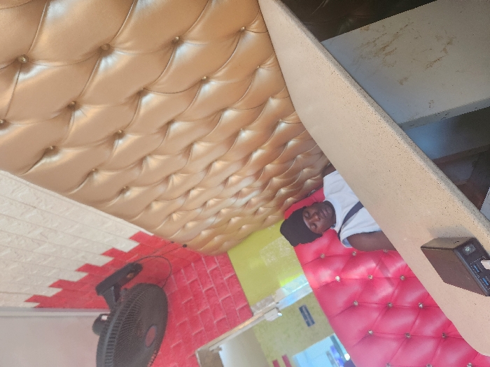 The scene depicts an interior view within an establishment in the city of Unknown, Unknown. One adult male is seated on a red, button-tufted banquette. He has a dark complexion, wears a black beanie, a white sleeveless shirt, and a dark strap diagonally across his chest. His eyes are closed or downcast. A speckled, light-colored countertop occupies the lower foreground, upon which a dark, rectangular electronic device, consistent with a power bank, rests. The background wall is horizontally divided: the lower section features red, faux-brick textured panels, and the upper section displays white, faux-brick textured panels. A black wall-mounted oscillating fan is affixed to the red wall section. To the right of the male subject, a large gold, button-tufted panel is prominently displayed on the wall.