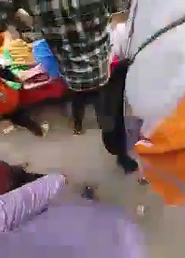 street vendor selling food from a cart on a busy city street. There are multiple people milling around the cart, appearing to examine and potentially purchase food. The vendor's cart has a red top and is covered with various food items. The street appears to be crowded with vendors and pedestrians. The lighting suggests it is daytime.