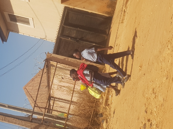 Two school-aged children walking away from the viewer on a dirt road beside a building with a window, metal gates, and a barbed wire fence