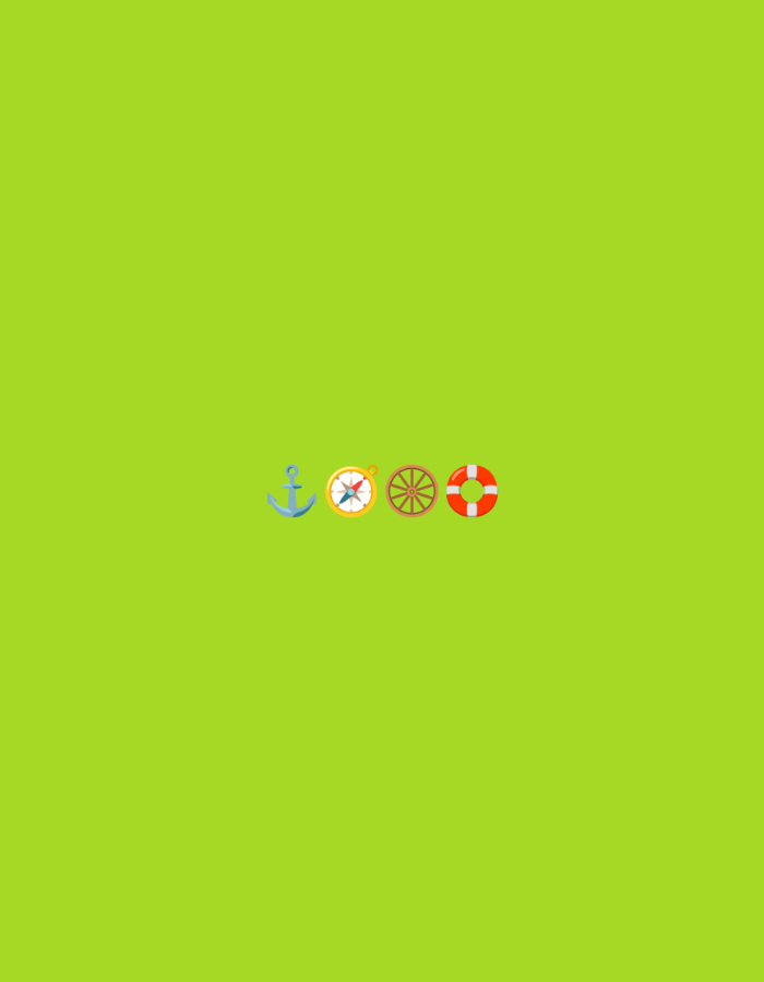 The image displays a uniform lime green background. Centered horizontally near the bottom, four maritime-themed digital icons are presented in a row. From left to right, these icons include a light blue anchor, a golden compass with a red needle, a brown ship's wheel, and a red and white lifebuoy. The scene is a graphic representation, and therefore, no physical location within the city of Netanya, Israel, or any other real-world environment, is depicted or identifiable. There are no people, actions, or interactions present in the image.