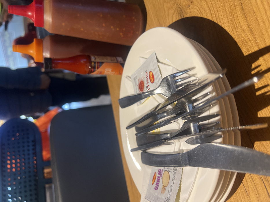 The image depicts a close-up, eye-level view of a dining table setting within an indoor restaurant or café environment. In the immediate foreground, a stack of four white ceramic plates rests on a light brown wooden tabletop. On the top plate, a collection of metallic cutlery is arranged, including one knife positioned on the far left and approximately seven forks clustered centrally. Two small white paper sachets are visible on the plate: one labeled "SHAN Garlic Powder" with a garlic illustration, and another labeled "SHAN CHILLI!" with a red chili icon. To the right of the plates, three condiment bottles are present. From left to right, partially obscured: a small red bottle with a black cap, a medium-sized amber bottle with an orange squeeze-top cap containing a reddish-brown sauce, and a larger clear bottle with a red squeeze-top cap containing a darker red sauce with visible chili flakes. The background is out of focus, revealing figures of people. One person is visible wearing a dark blue jacket, and another figure in orange is partially discernible further back. A dark blue, perforated object, possibly a light fixture, is visible on the far left of the background. The scene suggests a casual dining establishment in a public setting. The presence of "SHAN" brand products, a Pakistani food company, indicates a location within Pakistan, consistent with a restaurant or café in Islamabad. Specific identifiers for a precise location within Islamabad are not visible.