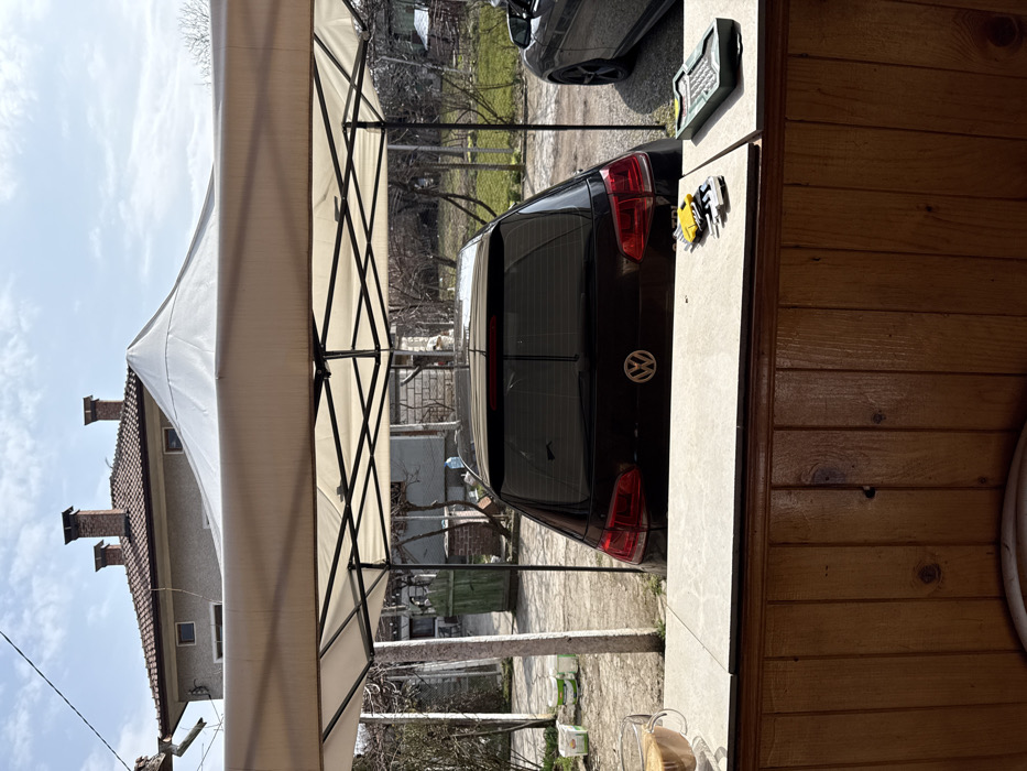 The scene depicts an outdoor residential area in Zhiten, Bulgaria, viewed from behind a wooden counter. On the light-colored counter surface, a clear glass mug with a light brown beverage is on the left, while a set of yellow and metallic hex keys and a dark green rectangular object are on the right. An overhead beige pop-up canopy tent with a black metal frame covers the immediate foreground. Directly beyond the counter, beneath the canopy, the rear of a dark-colored Volkswagen Golf TDI hatchback is parked, facing away. Its taillights are red, and the rear windows are tinted. To the right of the Volkswagen, the front left fender and wheel of another dark vehicle are partially visible. The background reveals an unpaved yard containing scattered, leafless deciduous trees and bushes. White plastic buckets are visible on the ground to the left. A light-colored two-story house with a red-tiled roof and three brick chimneys stands in the background under a partly cloudy sky. A green wooden gate is visible on the left side of the yard. Overhead utility wires traverse the sky. No individuals are present.