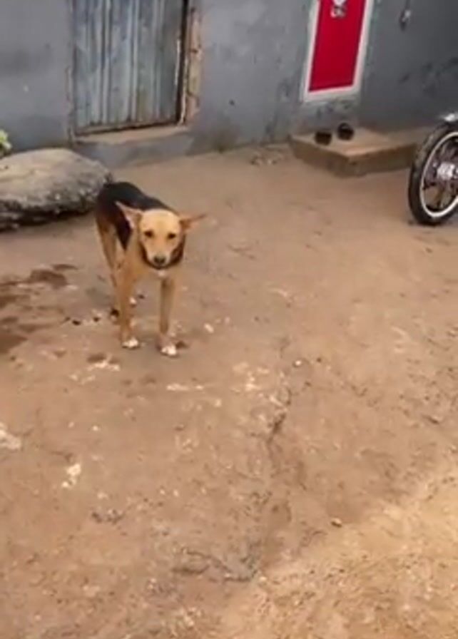 small, tan dog with a black back barking in a yard with dirt and gravel. The dog is facing the camera and barking, and the camera pans around the yard. There is a gray building with a metal door and a door with a red frame. A motorcycle is parked in the yard. A voice asks "Why are you barking at?" and "I love you."