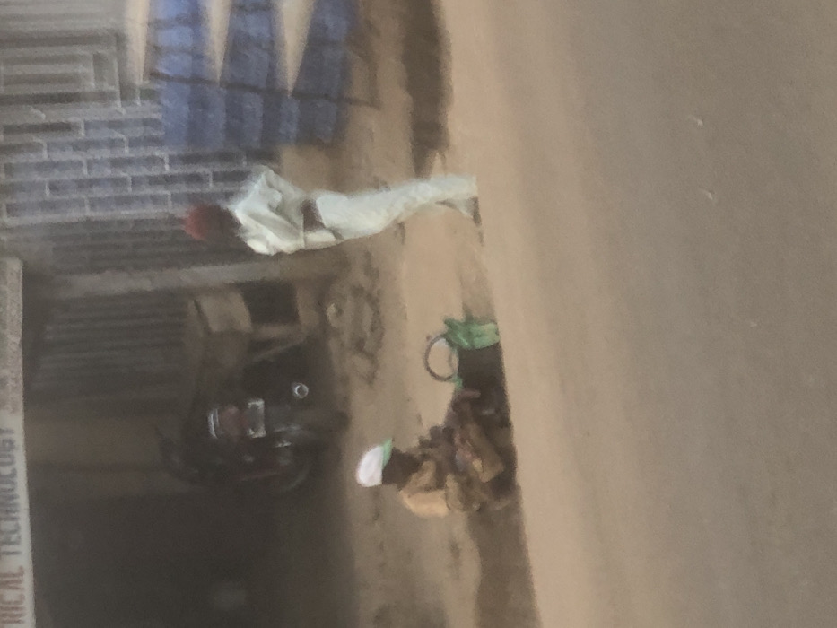 A rotated image shows a street scene. A man with a red head covering and white clothing stands near a brick building. A second person is seen wearing a white hat. A motorcycle is parked nearby. A green object rests on the ground near the second person. The view looks down from a high vantage point.