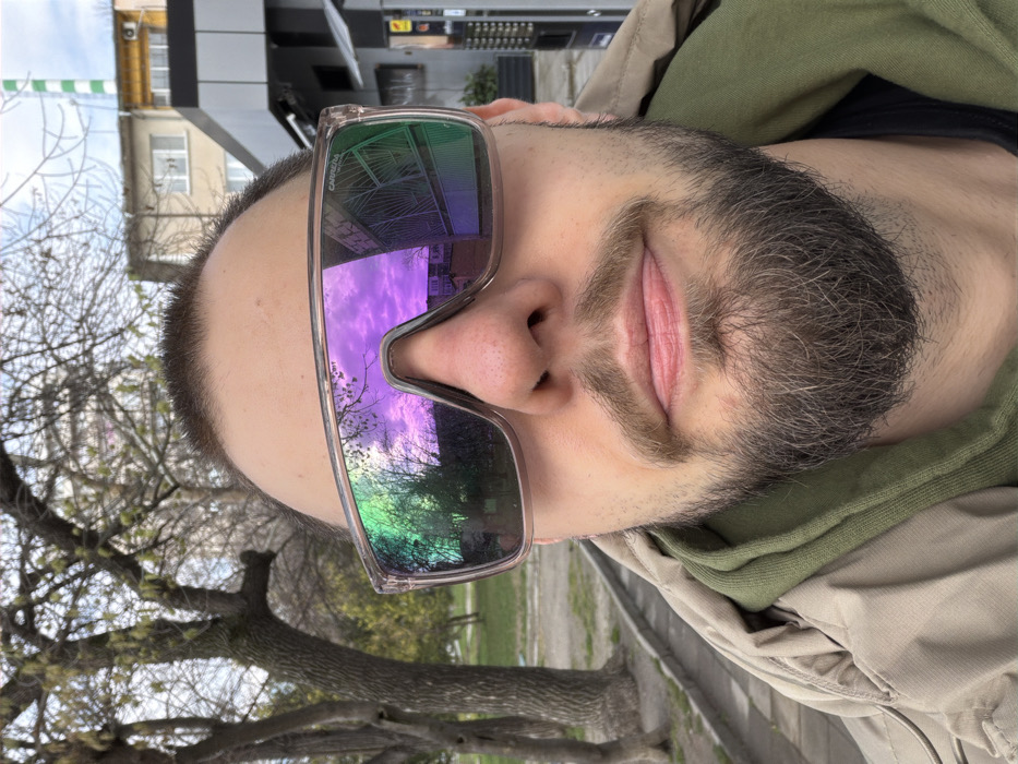 A male individual is depicted in a close-up, selfie-style photograph, presenting his upper torso and face. He has short dark hair, a light skin tone, and a full, well-groomed beard and mustache, predominantly dark brown with some lighter hairs. He wears large, transparent-framed Carrera sunglasses featuring highly reflective, iridescent lenses that appear green-blue on the left and purple-pink on the right, reflecting the surrounding environment. His lips are slightly parted. He is dressed in an olive green hooded garment beneath a light tan jacket. The background indicates an outdoor urban environment within Plovdiv, Bulgaria, specifically consistent with views from the Karshiyaka district. To the subject's left, a public green space with several bare deciduous trees, some showing initial signs of spring foliage, and a paved path are visible. The left sunglass lens reflects these trees and an overcast sky. To the subject's right, urban structures are present, including a light-colored building, a modern dark-paneled commercial kiosk or small shop, and a prominent green and white horizontally striped industrial chimney, characteristic of the Plovdiv Thermal Power Plant (TEC Plovdiv / ТЕЦ Север). The right sunglass lens reflects these buildings and a metal gate or fence, along with a distinctly purple hue from the sky. The sky appears uniformly overcast.