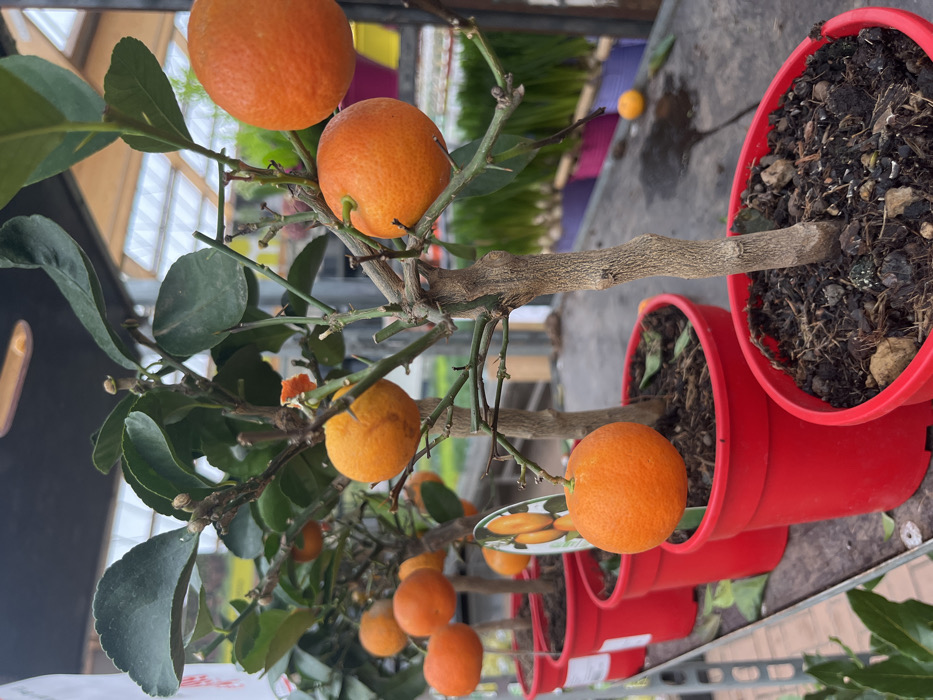 A row of small citrus trees in red plastic pots. The trees are laden with ripe oranges, interspersed with green leaves. The pots are filled with dark soil. The trees are arranged on a gray surface. Background shows blurred colors, possibly other plants or objects in a greenhouse or garden center.