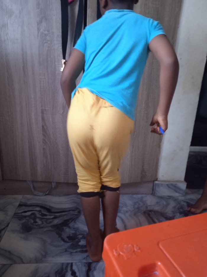The image captures an individual, likely a child, viewed from the back in an indoor setting. The subject wears a light blue short-sleeved t-shirt and yellow capri-length trousers with dark bands at the cuffs, and is barefoot. The individual stands on a patterned tiled floor, characterized by grey and black swirling designs. A small blue object, resembling a pen or marker, is held in the subject's left hand. The immediate background consists of a light brown wooden wardrobe or closet with vertical paneling. A black strap with a metallic clasp hangs vertically from the top left of the wardrobe. To the far right, a portion of another bare foot is visible, alongside a white wall and baseboard. In the lower right foreground, an orange plastic object, possibly a container or furniture piece, shows embossed circular details. The scene lacks specific identifying external landmarks but is consistent with a domestic interior found within Lagos, Nigeria.