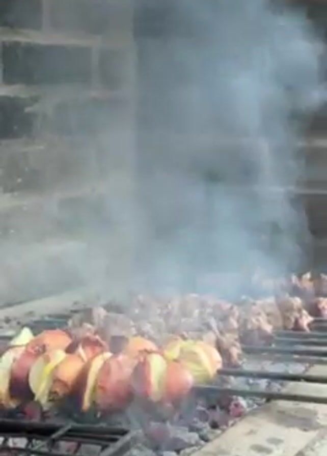 A metal grill sits over a bed of hot coals. Skewers with chunks of meat and onions are grilling, and smoke rises from the food. The grill is set into a brick structure.