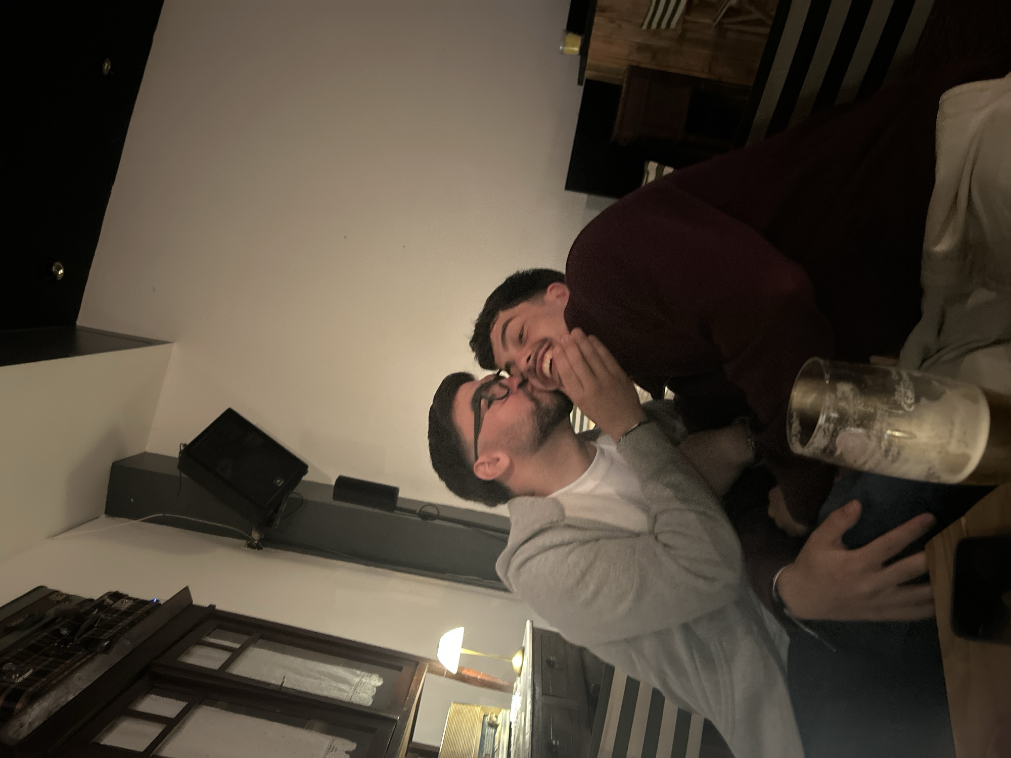 Two men are interacting closely. One man, with a beard and glasses, is wearing a white t-shirt with a grey cardigan and faces towards the other man. The other man is wearing a burgundy sweater and appears to be embracing the first man. A partially-filled glass of beer sits on a table in the foreground, next to a cell phone. The scene is indoors, potentially in a bar or restaurant, evidenced by speakers on the wall, striped wallpaper, and general low lighting. No further specifics can be inferred about the city of Mirandela, Portugal.